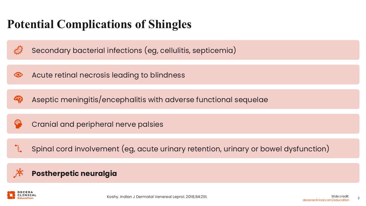 Shingles can cause significant morbidity. It is more than just a vesicle; it is more than just a rash. There are potentially serious complications.3 The one we talk most about is postherpetic neuralgia (PHN) because this can be significantly debilitating. PHN is a nerve pain that is very difficult to control. It does not disappear after the vesicles are gone; it lasts at least 3 months after the rash is resolved. This is highly debilitating and is more common in older people.3