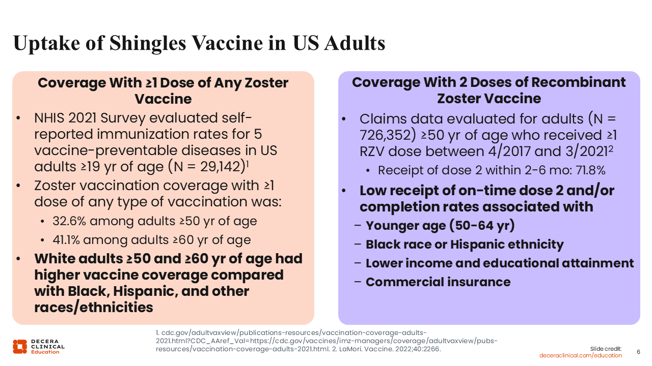 The uptake of the shingles vaccine in the US is not as high as it should be because we, HCPs, are falling short of vaccinating everyone who is eligible. In addition, there is inequity in who is vaccinated. Those who are more susceptible to complications and who would benefit the most from vaccination are less likely to be vaccinated. We can do better.9,10