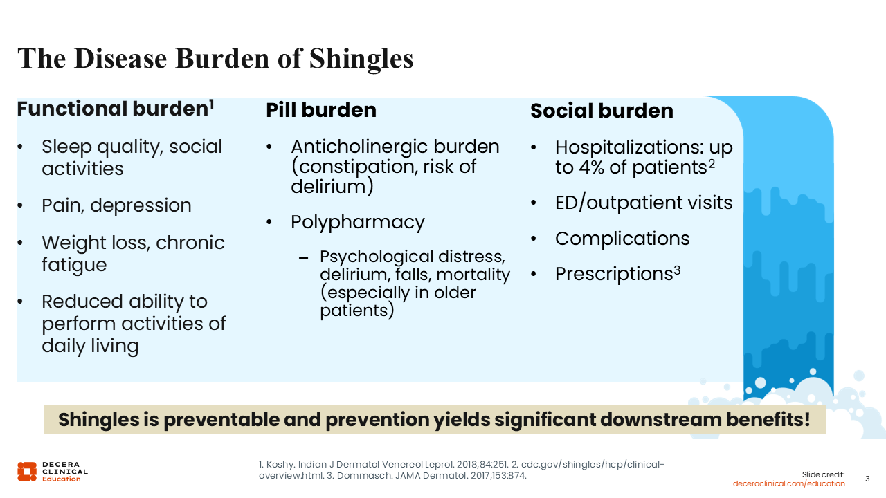 Shingles is an all-encompassing infection that can affect morbidity, but it is preventable with the RZV. Prevention also yields significant downstream benefits2-4