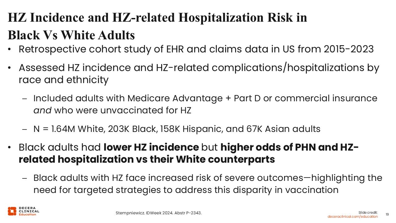 Let us move on to disparities in the shingles vaccine access and uptake. A study presented at IDWeek in 2024—and now published— found differences in the incidence of herpes zoster infection and the development of PHN- and herpes zoster–related hospitalization by race and ethnicity. An interesting finding was that Black patients had a lower incidence of herpes zoster infection but higher odds of PHN- and herpes zoster–related hospitalization.