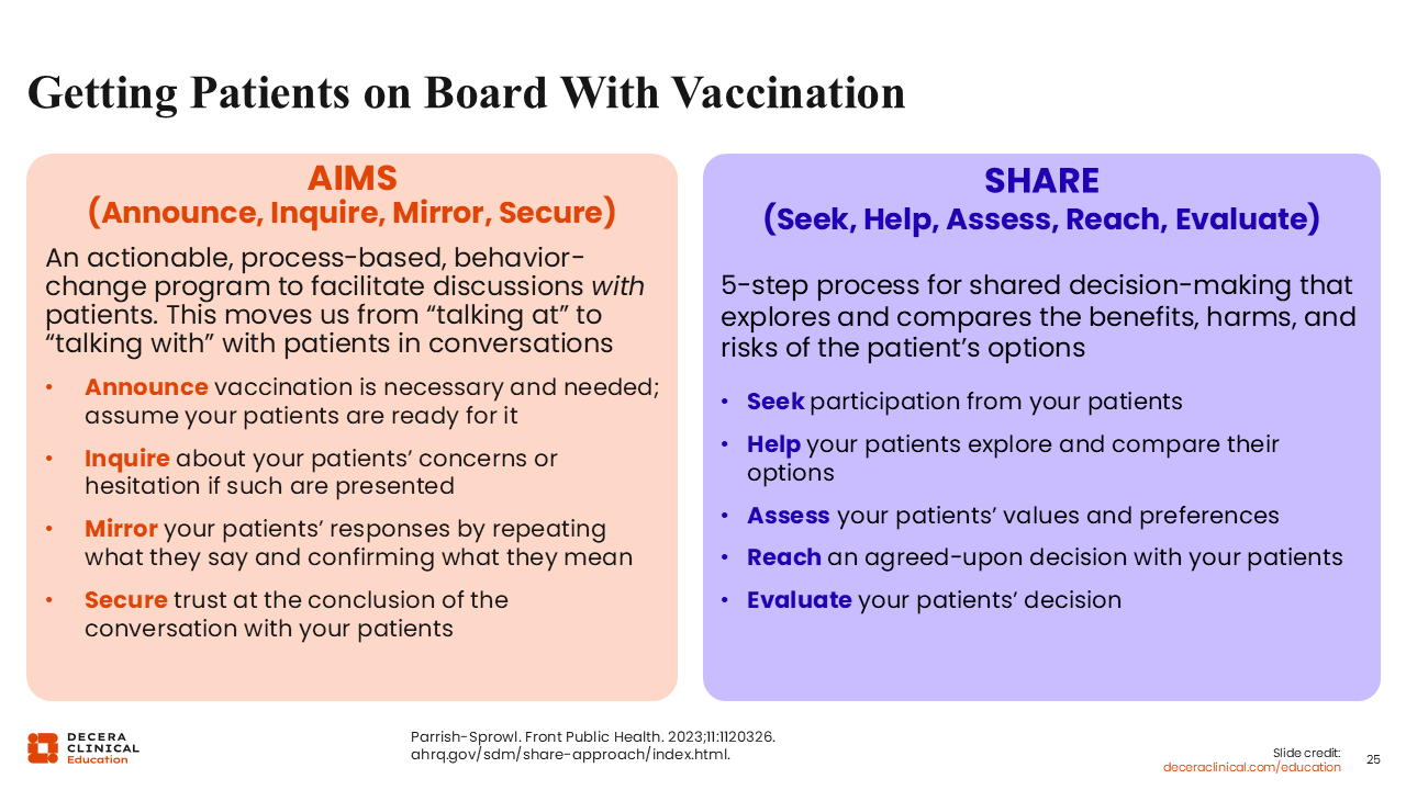 This slide illustrates some guiding points for getting patients on board with vaccination. There are “AIMS” and “SHARE”—2 different, evidence-based frameworks HCPs can use.28,29