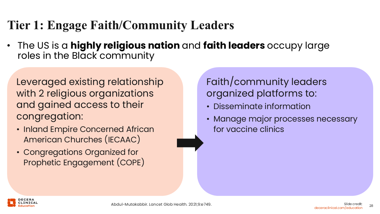 Going into more detail about tier 1, HCPs must work with a community-based organization to do this. That community-based organization helps with facilitating communication with local churches and their parishioners. In the United States, especially for historically marginalized groups, faith leaders and community play a big role.