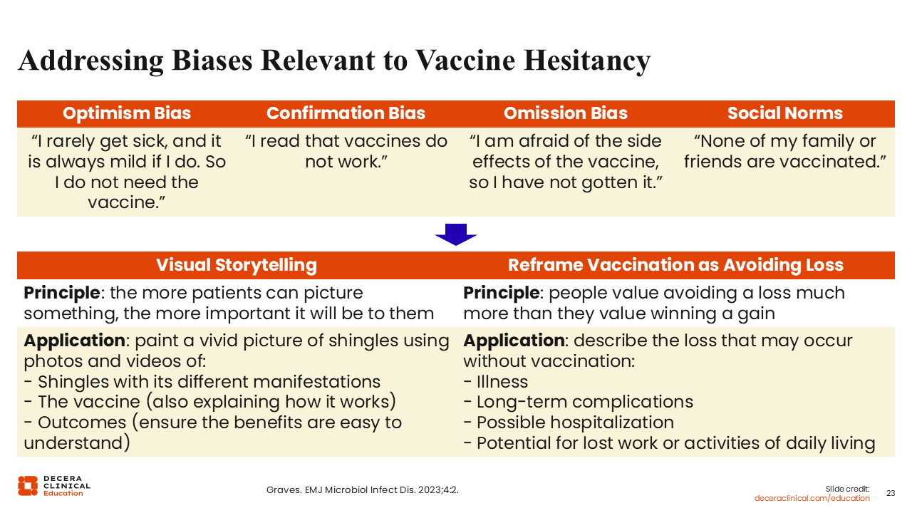 Something that a colleague told me once is that she would listen to what it was that patients brought forth. She would respond, "Yes, you have heard this information. I am not going to invalidate that you have heard this information, and…" After that "and," she would provide patients the facts. I think that is a great way for us to approach the shingles vaccine, especially in the current climate. We should acknowledge what patients have heard, after which we, as knowledgeable HCPs, should provide any information that we have.