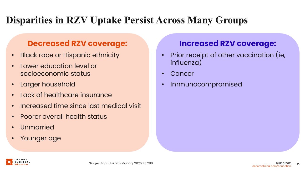 Let us consider other disparities and why they exist. First, RZV coverage remains lower among Black and Hispanic adults compared with White adults despite ACIP recommendations. RZV coverage rates are generally higher among those with an associates or more advanced degree. But coverage is significantly lower among those with low socioeconomic status or a lack of health insurance coverage. Finally, RZV coverage is significantly higher among those with coadministration of the influenza vaccination. So those who do not receive the influenza vaccine are less likely to also get the shingles vaccine.25