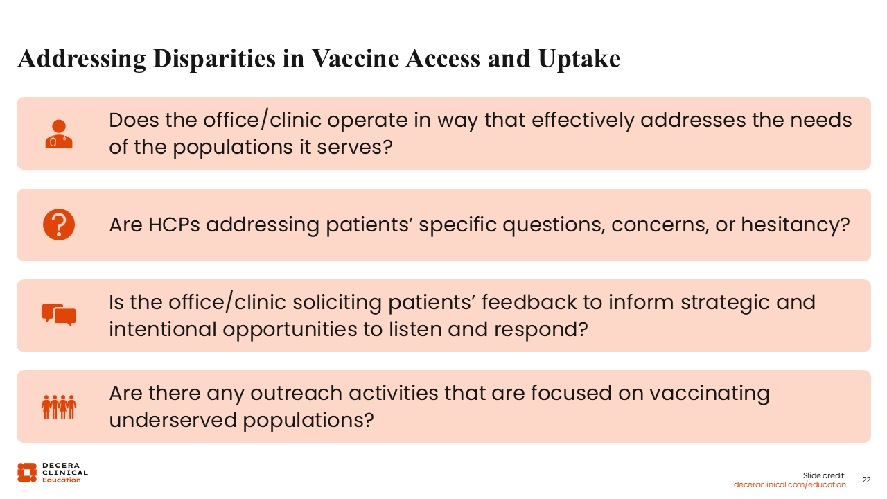 There are numerous checkpoints in healthcare where HCPs outside of primary care can be involved in helping improve vaccine uptake. So empower your staff and the people around you to engage in vaccine conversations with their patients. We do not want all the pressure placed on 1 particular discipline.