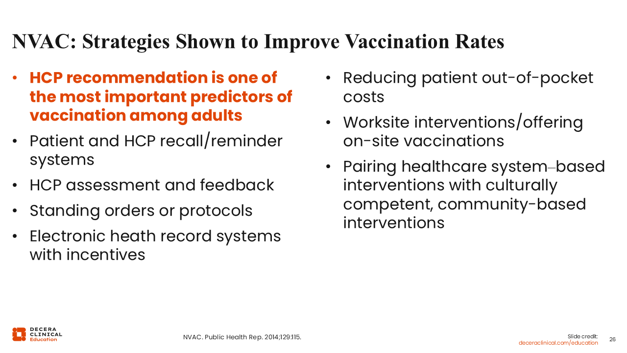 There other strategies that can help us improve vaccine uptake. For example, HCP recommendation is one of the strongest predictors of vaccination. So please remember the power of your own recommendation.