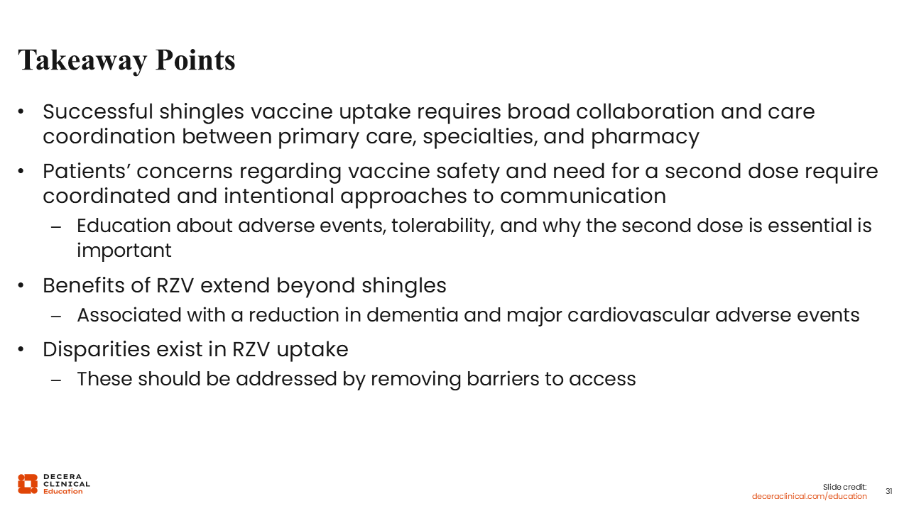 Bringing it home, this is a team-based opportunity across the healthcare continuum and within every discipline. Patients are the constant in the equation of healthcare, and every opportunity we have for interaction should include discussion about vaccines, including the shingles vaccine.