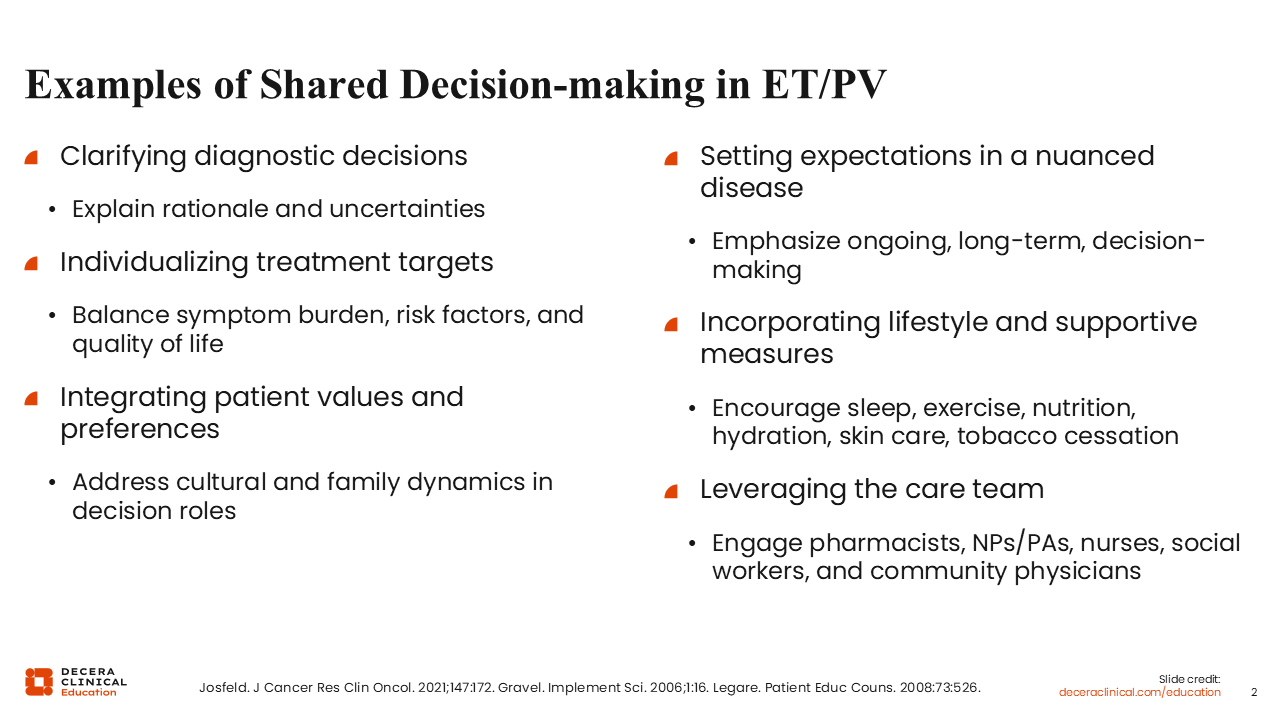 ET and PV are myeloproliferative neoplasms (MPNs) associated with thrombocytosis and erythrocytosis, respectively.1,2 Both ET and PV increase the risk of thrombosis. Management is lifelong, individualized, and includes aspirin, phlebotomy, and cytoreduction.3 MPNs are heterogeneous in presentation, including variable symptom burden leading to complex treatment choices. SDM helps in building rapport, aligning care with patient values, personalizing treatment, and enhancing adherence to treatment plans by ensuring that the patient understands the “why” behind the treatment approach. In the initial visit with patients with ET and PV, it is important to give a brief introduction to what MPNs are, the pathophysiology of these diseases, and the potential disease complications to anticipate (eg, thrombosis, symptom burden). This needs to be done in a manner that is tailored for the patient at their level of health literacy and with consideration to their preference for information.