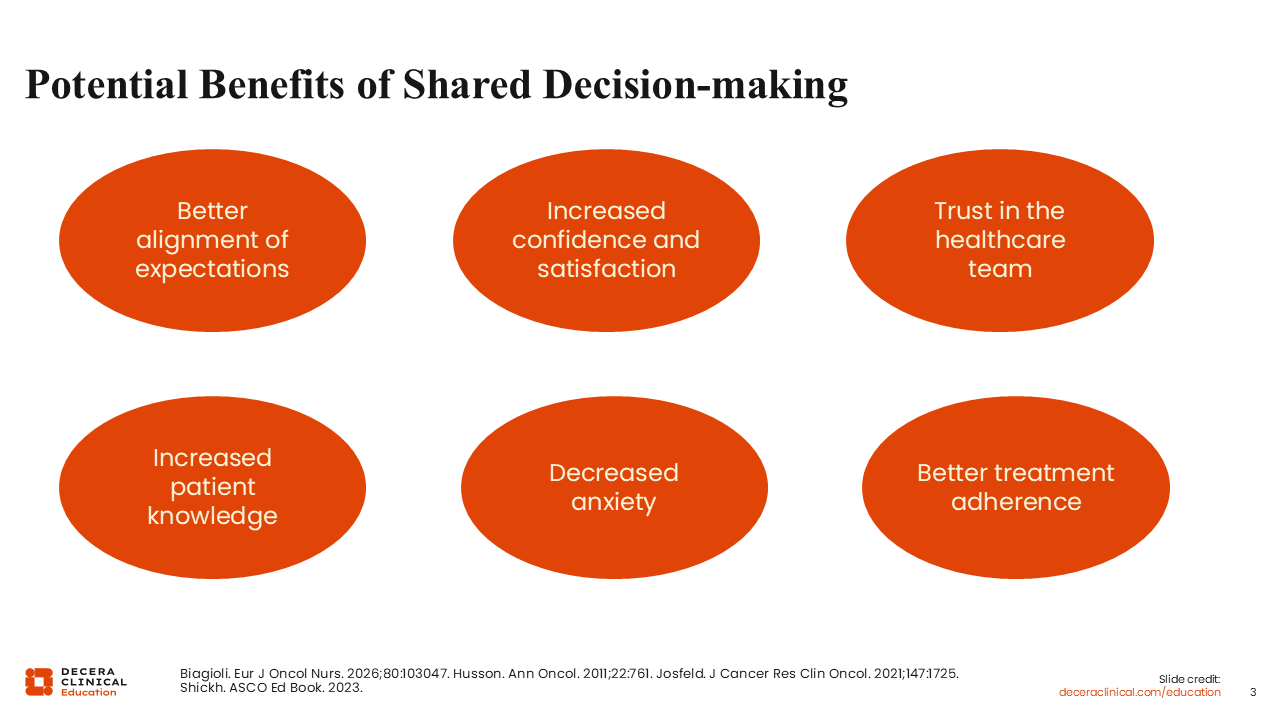 I think primarily SDM results in a better alignment of care when evidence is shared with patients. It helps them to understand what to expect in terms of adverse events and the goals of therapy. Confidence and satisfaction are increased when the patient knows that their preferences have been part of the decision-making process. Patients who engage in SDM are likely to have better treatment adherence.4,10,14,15