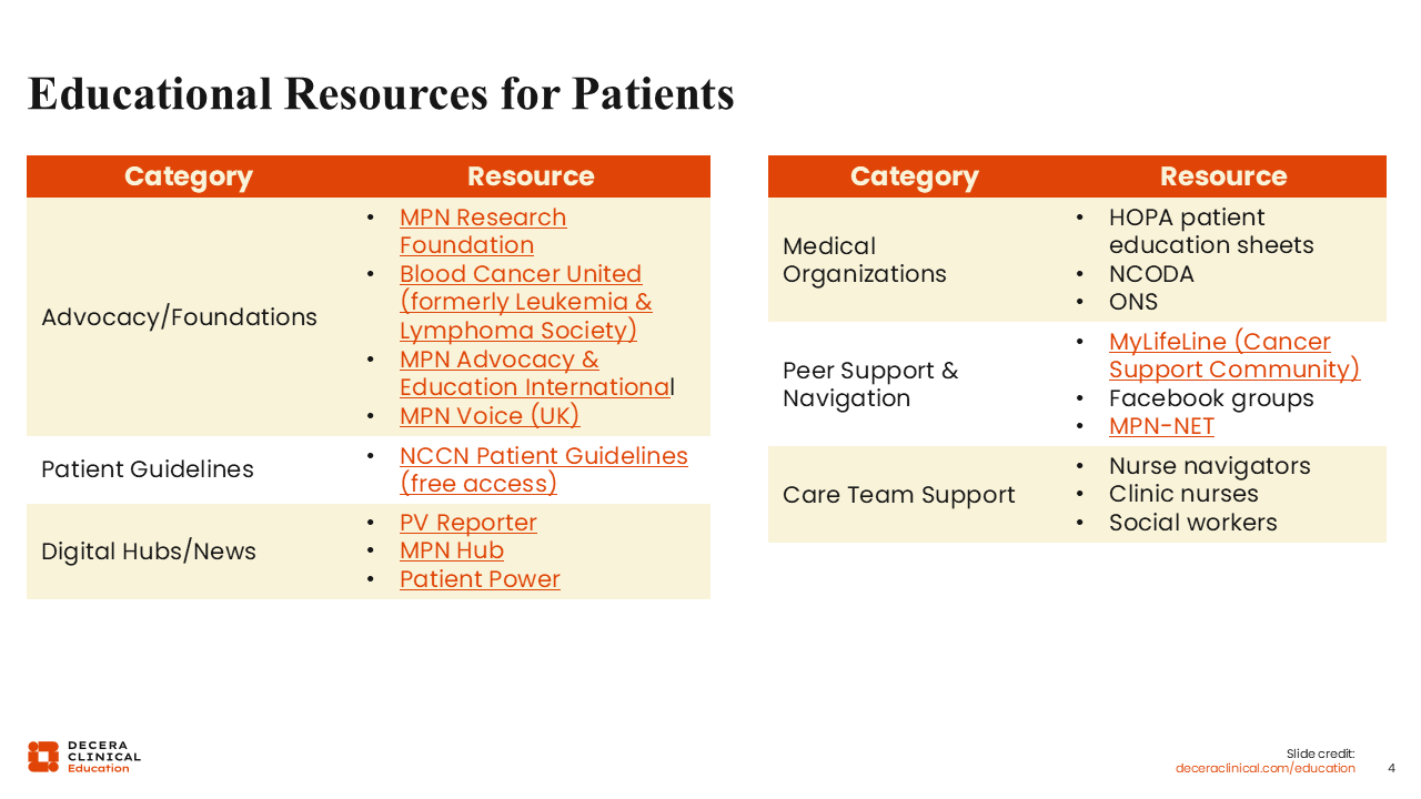 SDM in ET/PV can be enhanced by ensuring that patients have access to trustworthy, carefully screened educational resources that help them understand their disease and engage effectively in discussions about their care. Patients may come to their appointments after researching social media groups, online forums, or AI platforms. Guide patients to trusted sources, including national patient advocacy groups, expert-developed education materials, and reliable clinical information websites.