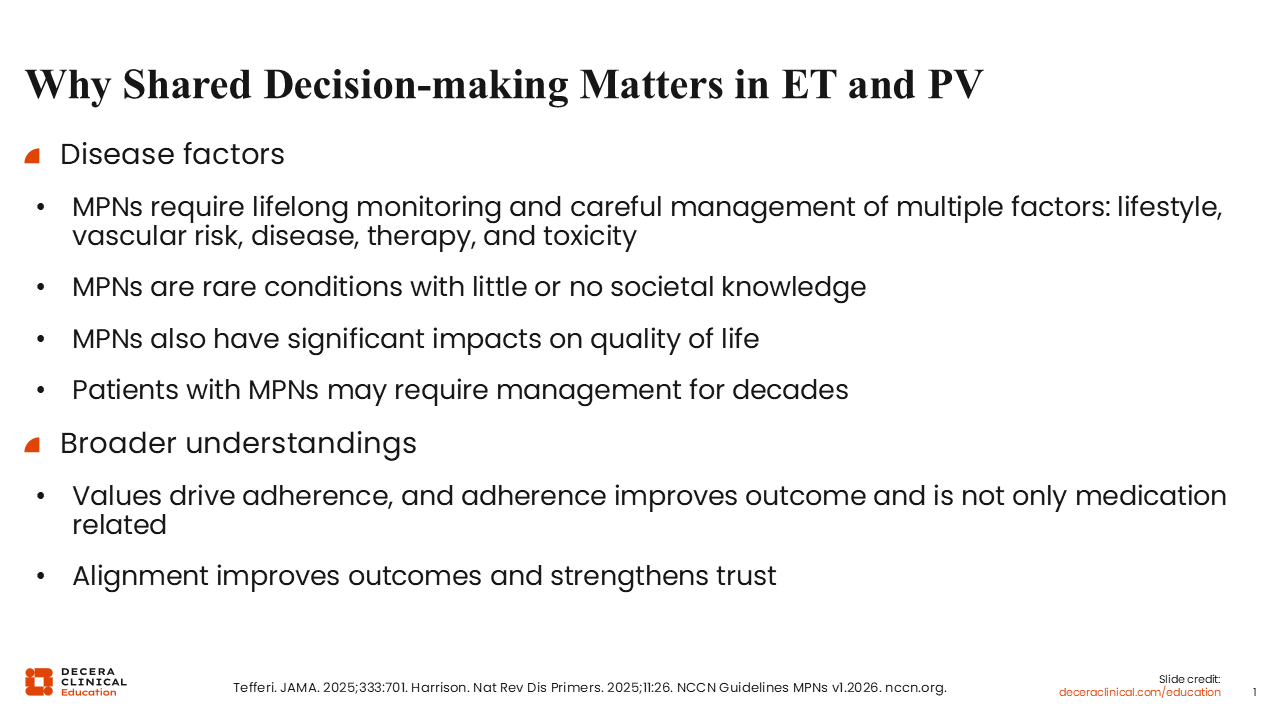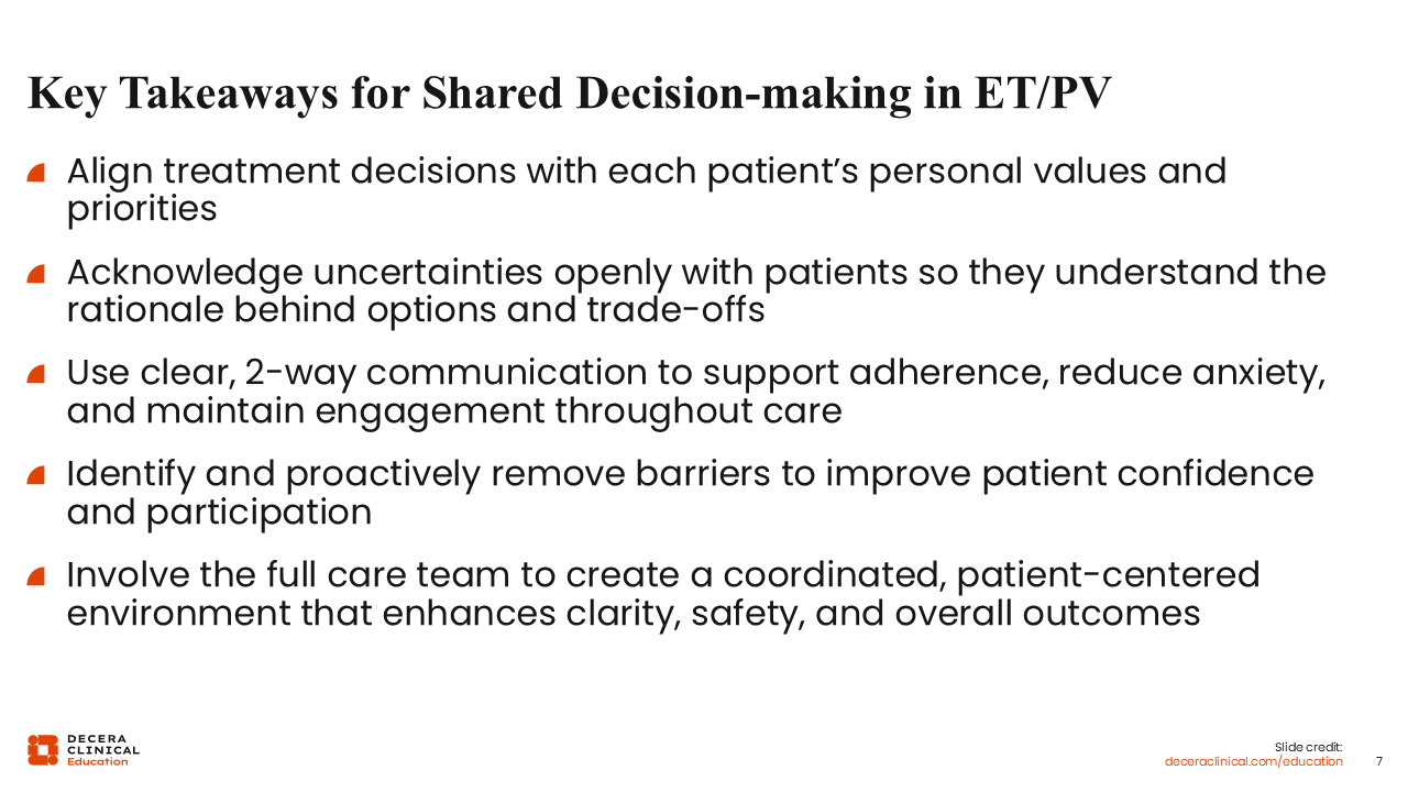 Effective SDM in ET/PV means aligning therapy with patient values, explicitly linking each recommendation to what matters most to the individual. HCPs should acknowledge areas of uncertainty and offer the pros and cons of each option. Clear, bidirectional communication supports adherence, helps align expectations, reduces anxiety, and sustains engagement over a chronic care journey. Proactively removing barriers and activating the full care team creates a cohesive, patient-centered environment that minimizes confusion, improves safety, and ultimately improves outcomes.