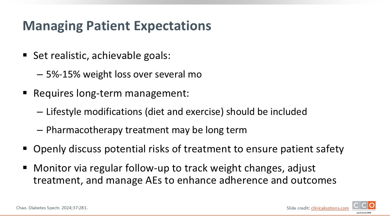 Obesity management must be individualized. HCPs should choose AOMs or other weight loss strategies based on patients’ goals and comorbidities. With Raychel, we can choose AOMs or another strategy to help her lose weight before she conceives her next child.