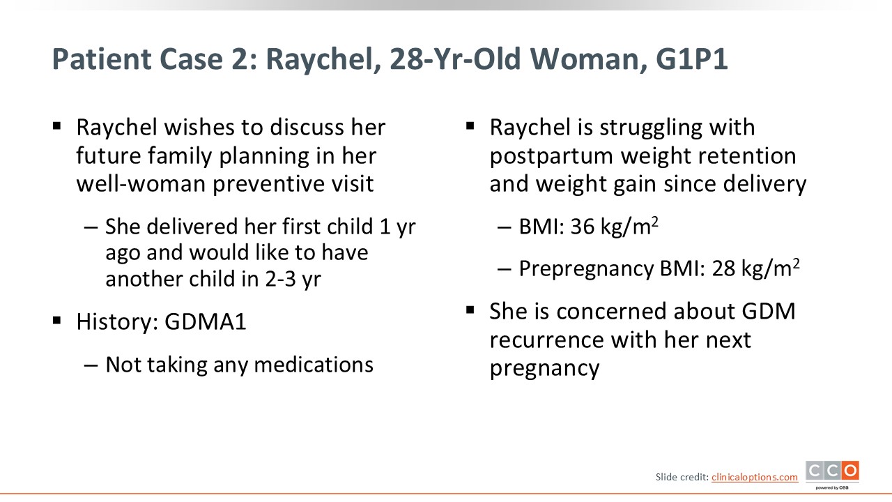 Raychel is typical of patients who OB/GYN HCPs see every day. It is certainly important to reduce the risk of gestational diabetes and optimize Raychel’s weight so she feels healthier before her next pregnancy.