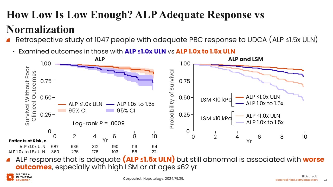 When biochemical response is considered together with fibrosis stage, people with lower fibrosis burden had better outcomes, even with higher ALP.9