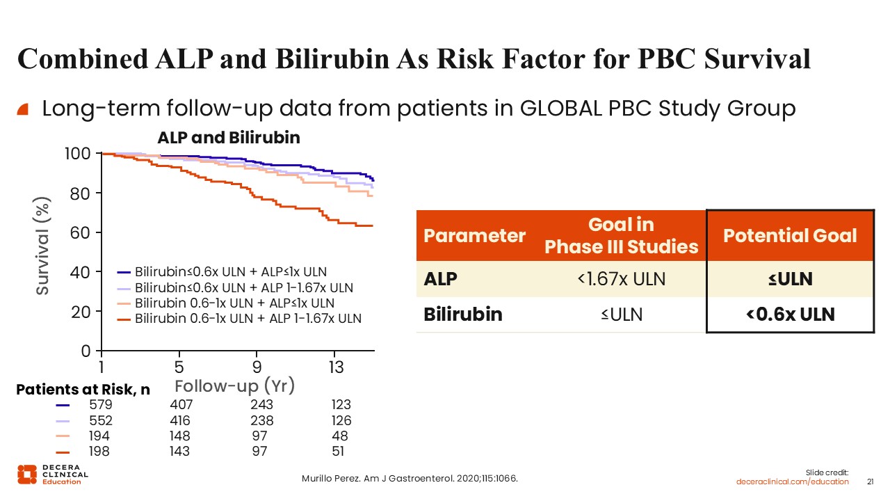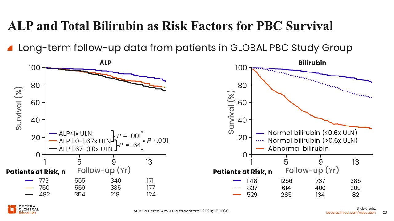 Long-term follow-up data from the GLOBAL PBC Study Group demonstrate that outcomes are closely associated with ALP and bilirubin levels.8