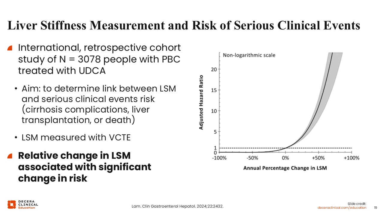 PBC is a dynamic disease. Studies evaluating changes in liver stiffness have shown that shifts correlate with changes in the risk of liver-related outcomes.