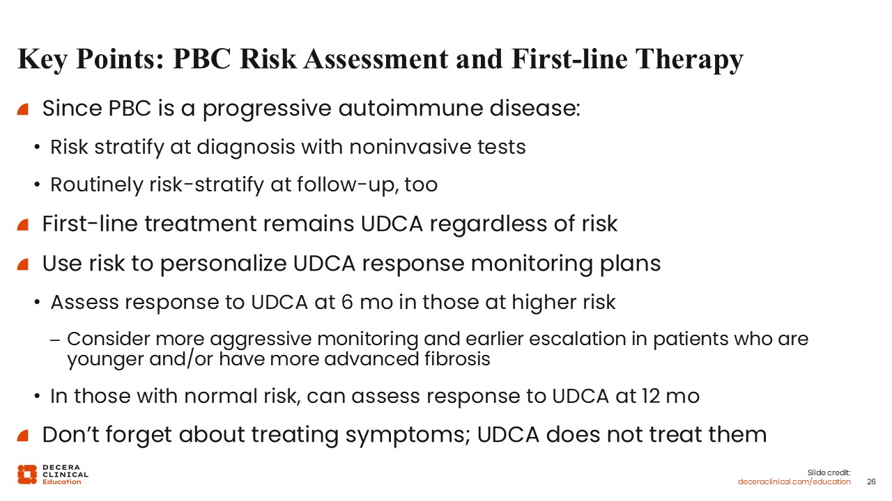 To summarize, PBC is a progressive autoimmune liver disease that requires careful risk stratification and monitoring.