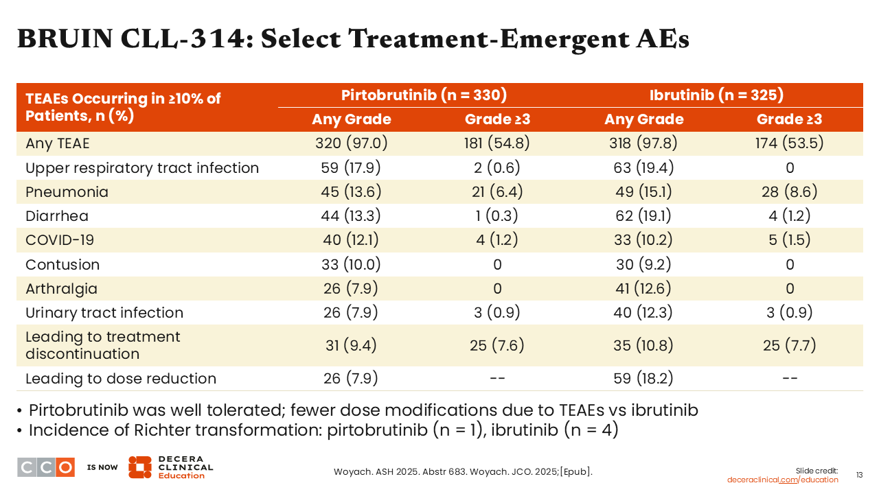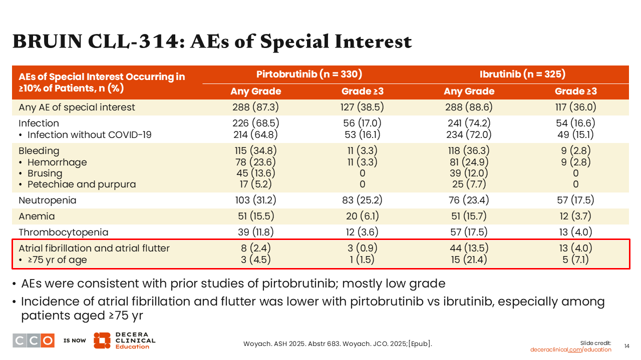 Of note, data from the randomized phase III BRUIN CLL-313 trial were also presented at ASH 2025. In this study, pirtobrutinib demonstrated significant efficacy improvements over bendamustine plus rituximab in patients with treatment-naive CLL/SLL (24-month PFS: 93.4% vs 70.7%; P <.0001; ORR: 94.3% vs 80.9%). Pirtobrutinib was again associated with low rates of atrial fibrillation/flutter (1.4%).