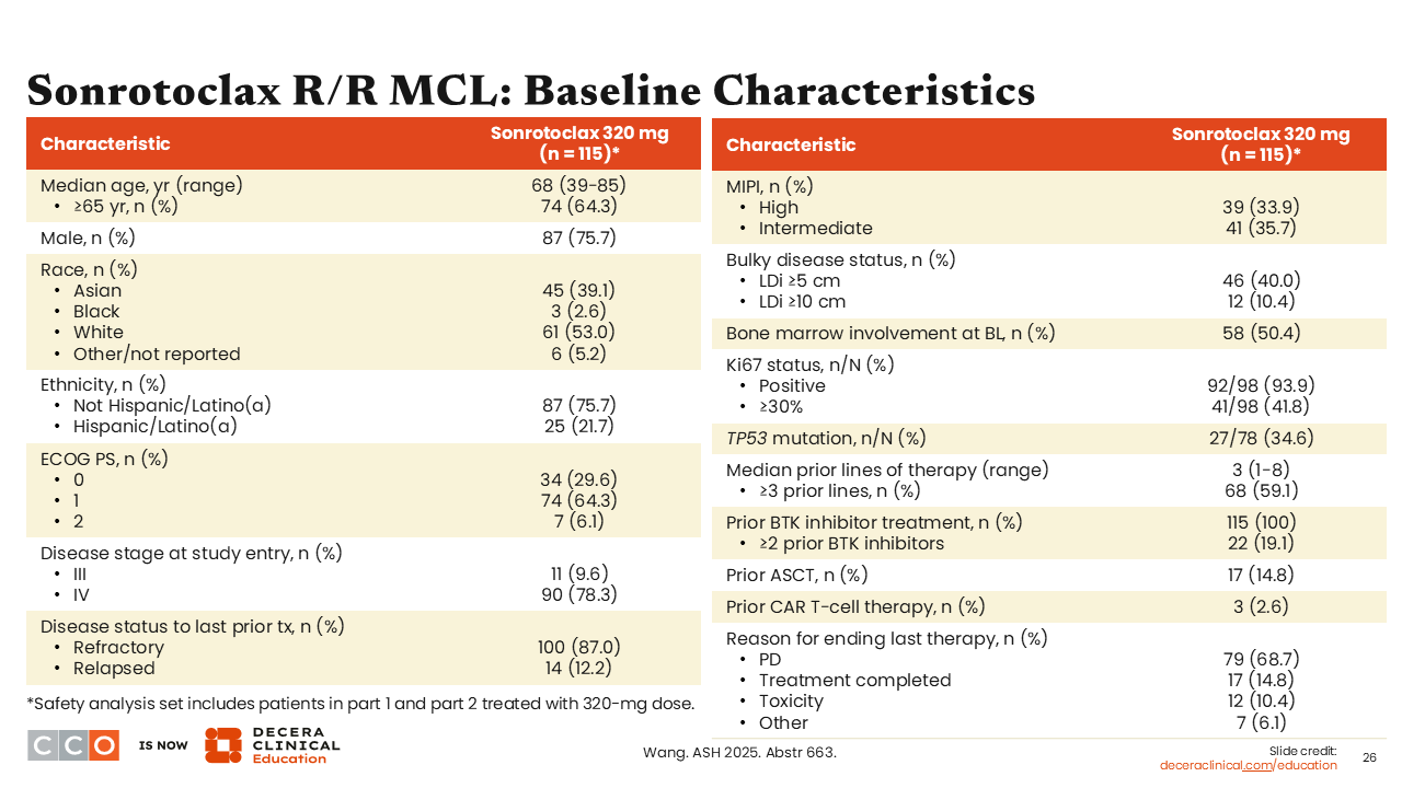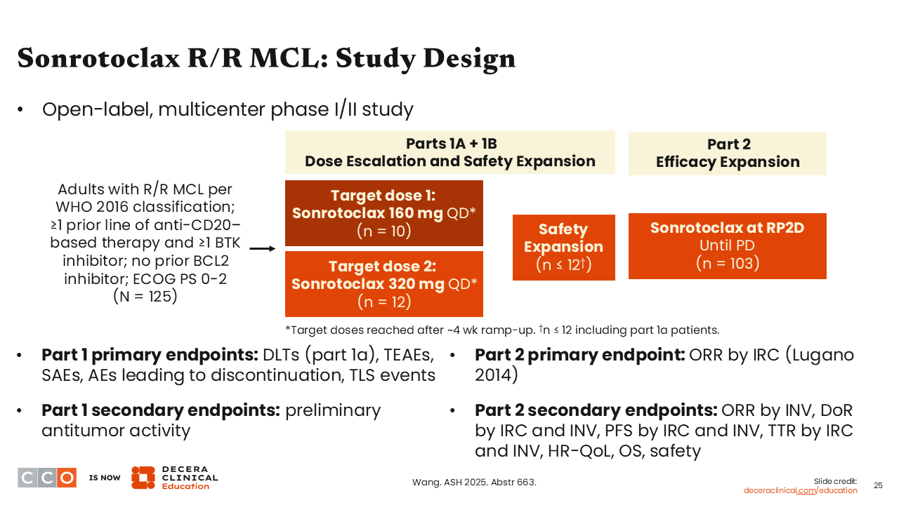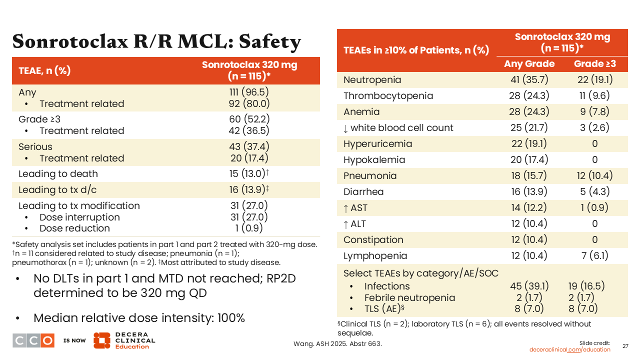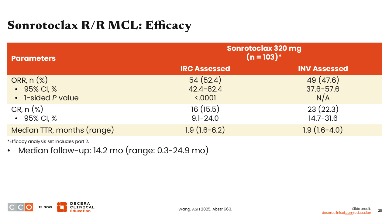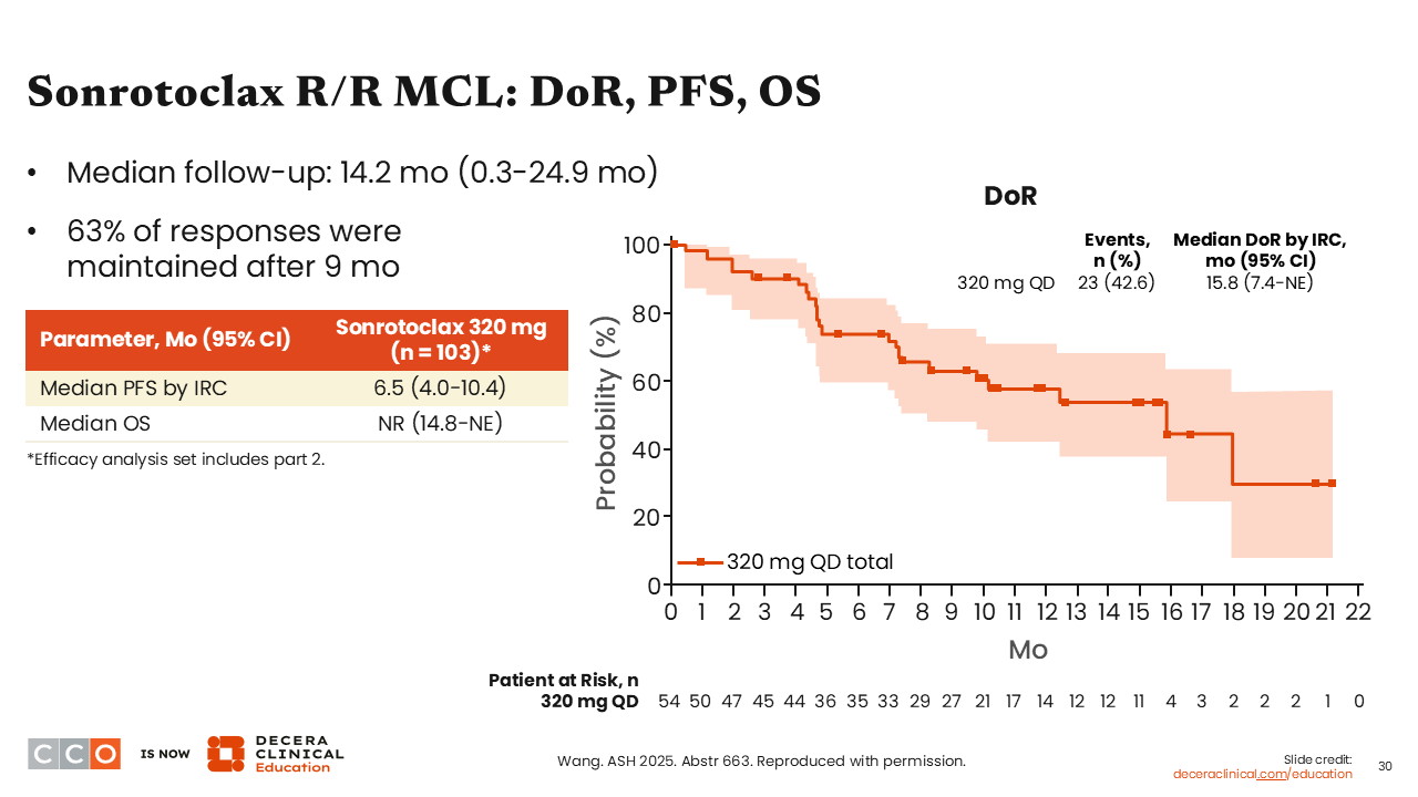 Our next study of interest assessed sonrotoclax, a next-generation BCL2 inhibitor, as monotherapy in patients with R/R mantle cell lymphoma (MCL) who had previously received a BTK inhibitor.20