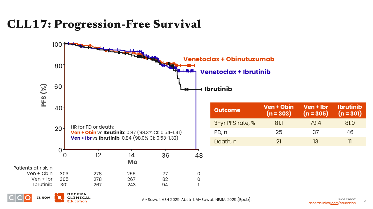 Venetoclax plus obinutuzumab is validated here as highly effective and has the highest rate of MRD undetectability; this does not appear to impact PFS, at least at the 3-year time point. So, both are appropriate time-limited strategies, and I think this continues the shift away from single-agent BTK inhibition.
