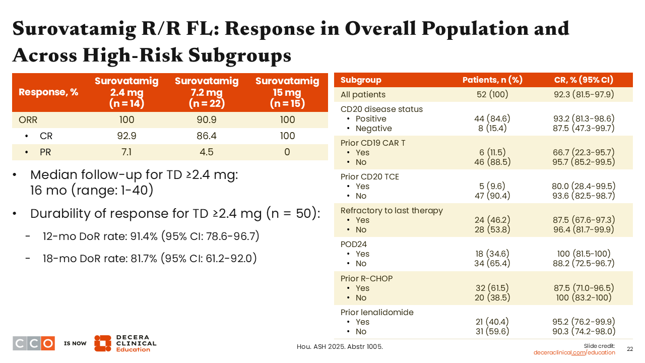 The response rates with surovatamig were impressive. Among the 14 patients in the 2.4-mg cohort, the ORR was 100%, with the majority being CRs (92.9%). At 7.2 mg, the ORR was 90.9%, with 86.4% CRs, and at the 15-mg dose, the ORR was 100%, all CRs. This is not something we see very often in a phase I clinical trial.