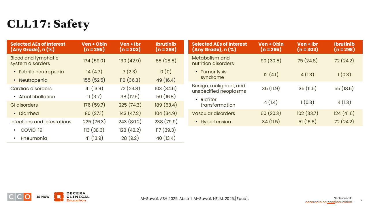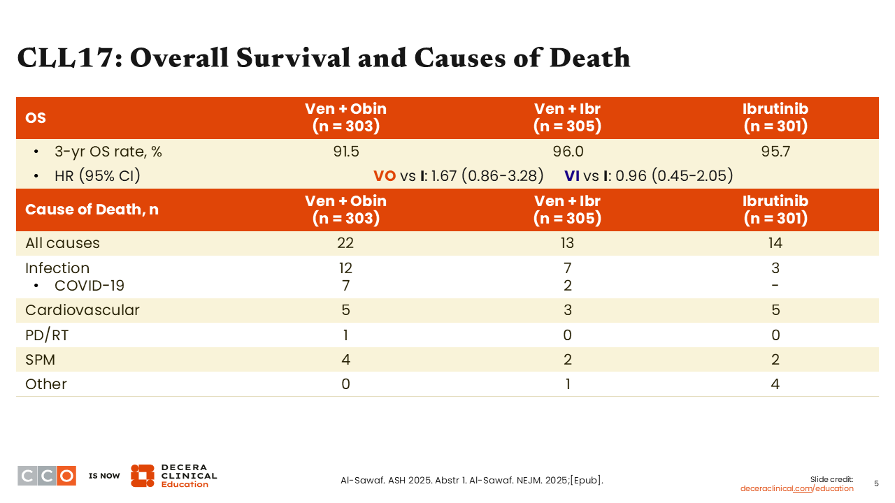But I think in the context of the AMPLIFY trial, the CLL17 trial validates that a BTK inhibitor plus venetoclax-based approach is highly effective. As Dr Kahl pointed out, these studies have shown that obinutuzumab-containing arms have higher rates of infection, including serious infections. This study adds to my shift to considering acalabrutinib plus venetoclax as a highly effective time-limited therapy option for most patients.