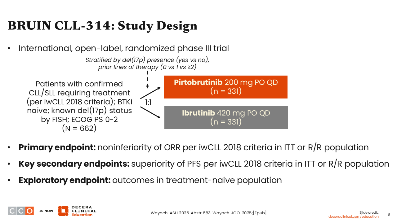 The BRUIN CLL-314 study assessed whether the noncovalent BTK inhibitor pirtobrutinib is noninferior to the covalent BTK inhibitor ibrutinib for BTK inhibitor-naive CLL.5