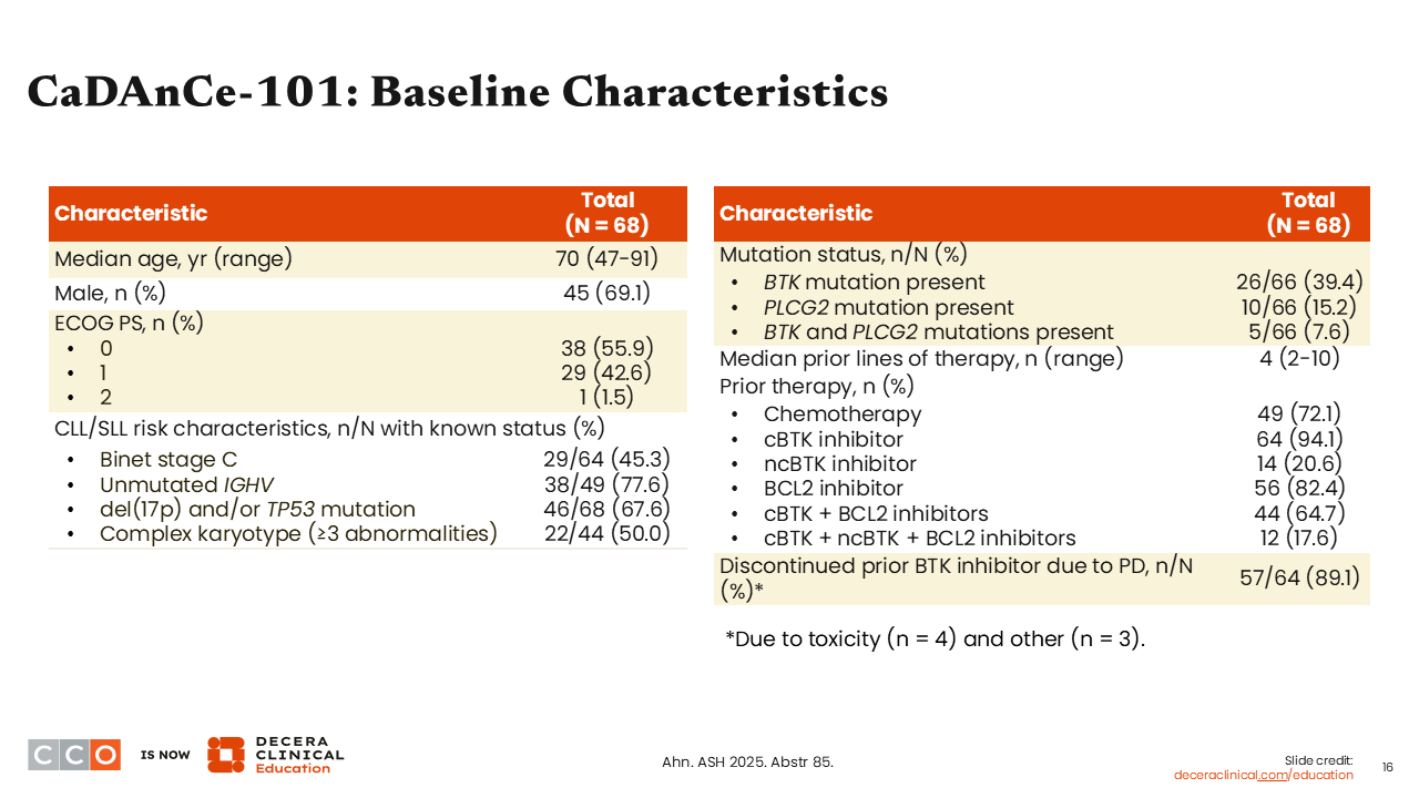 This was a heavily pretreated, high-risk group.11 Almost all patients had received a prior covalent BTK inhibitor. Many patients had received a prior noncovalent BTK inhibitor, and most patients had a prior BCL2 inhibitor. TP53 mutations and/or del(17p) were present in 67.6% of patients.