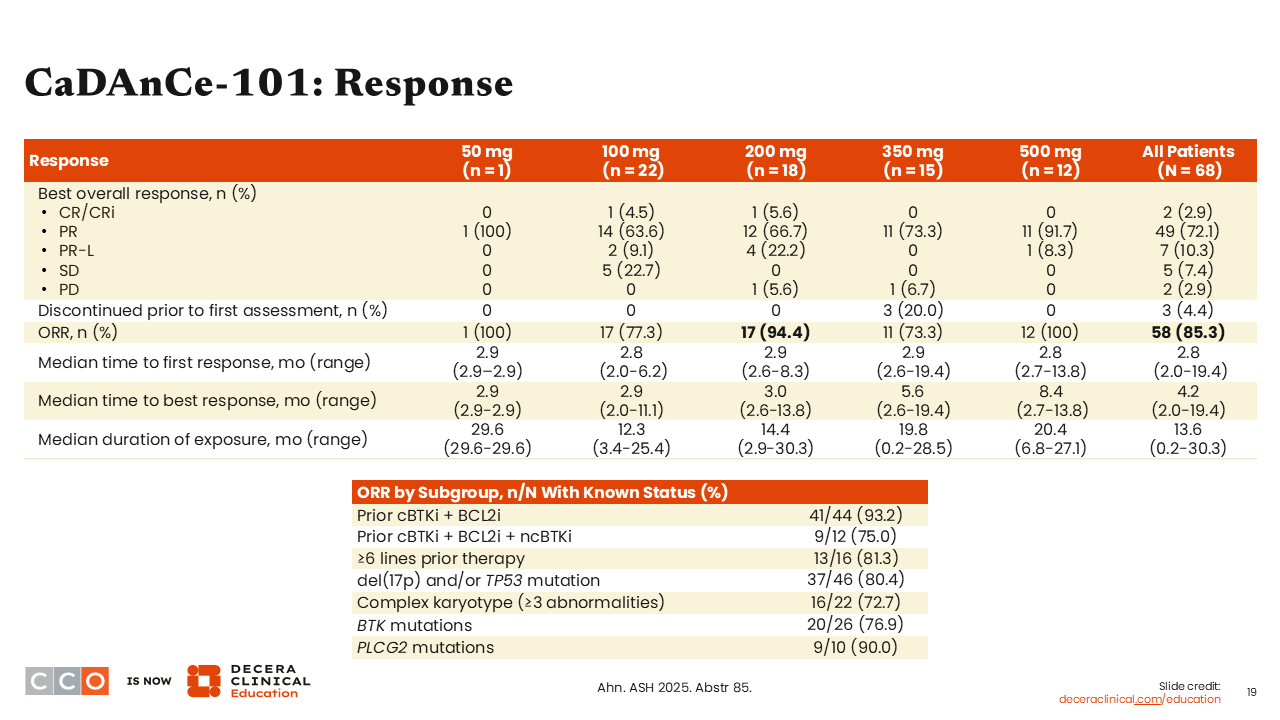 Next, let’s discuss the updated analysis of the phase I CaDAnCe-101 study of the BTK degrader BGB-16673 in R/R CLL.11