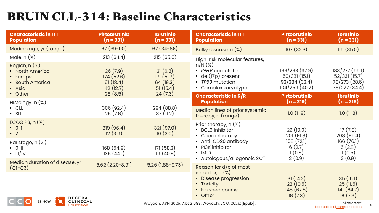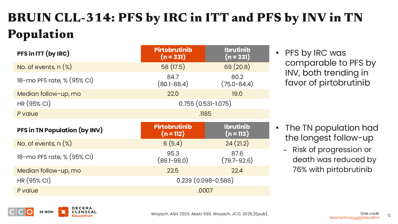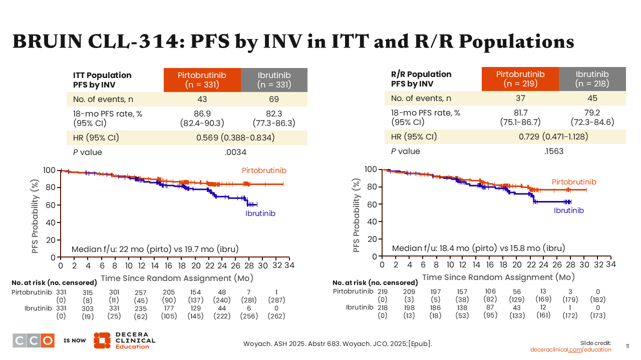 BRUIN CLL-314 was another very important study with data presented at ASH 2025. This phase III study compared pirtobrutinib vs ibrutinib in treatment-naive or R/R CLL.5 This is the very first study we have comparing covalent vs noncovalent BTK inhibitors in a randomized, controlled trial.