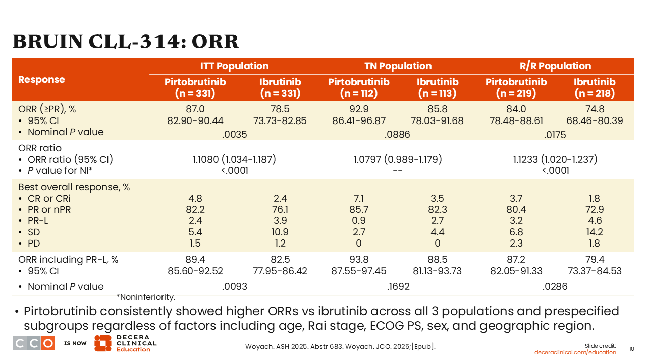 Looking at the primary endpoint of ORR, although outcomes were favorable in both arms, a higher ORR was observed with pirtobrutinib at 87.0% compared with ibrutinib at 78.5% in the ITT population (P = .0035). ORRs were higher with pirtobrutinib in both the treatment-naive and R/R populations.