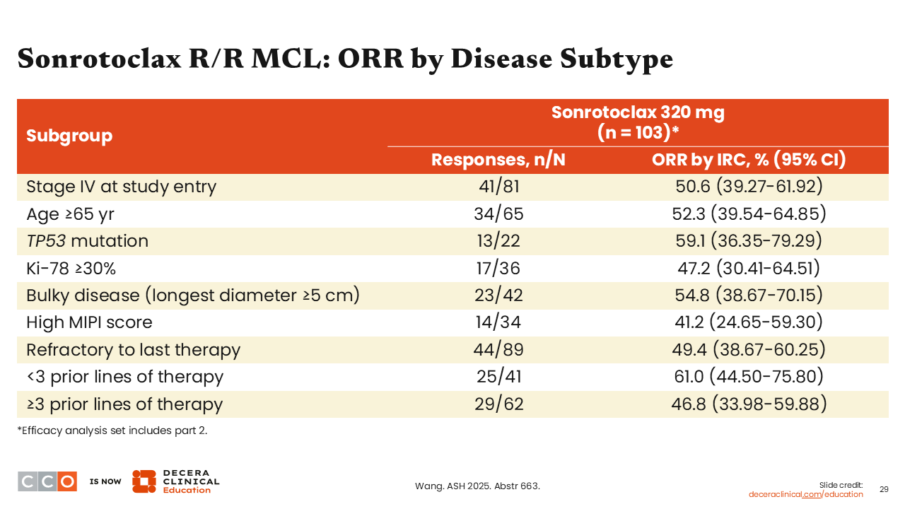 Sonrotoclax R/R MCL: ORR by Disease Subtype