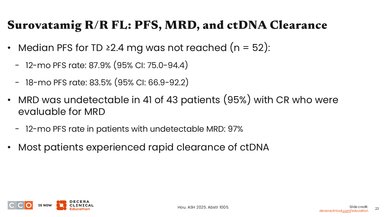Surovatamig is a novel BsAb targeting CD19 and CD3 that showed very impressive early response data in R/R FL with an acceptable safety profile. I think we are going to see a lot of development of this drug now, given this very promising phase I signal. This agent is now being assessed in phase II and III clinical trials in patients with FL.