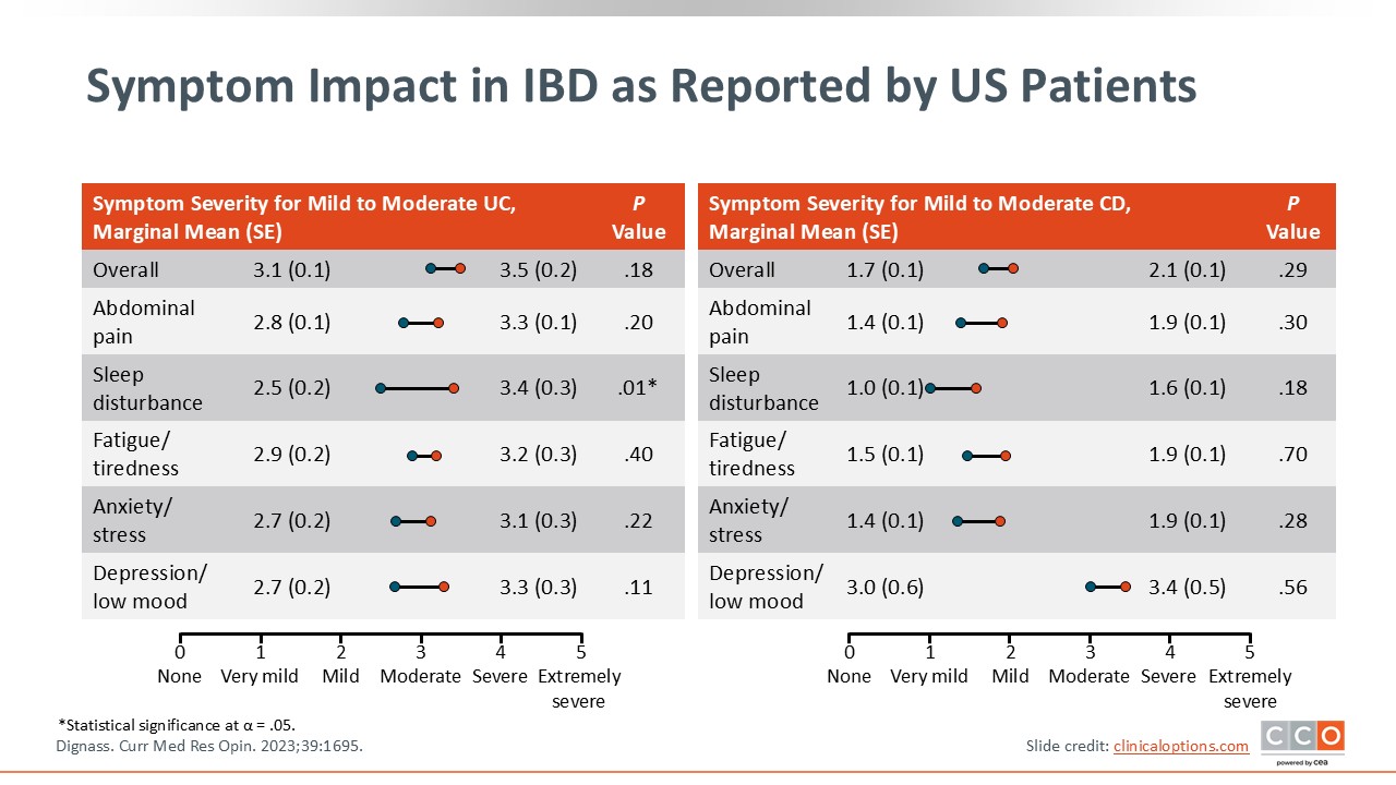 For the patients living with IBD in the United States, their symptom burden is significant. Many report significant moderate to severe abdominal pain, sleep disturbances, fatigue, anxiety, and depression, among other symptoms. This is important because when we evaluate patients with IBD, HCPs should ask about their gastrointestinal symptoms and their systemic symptoms like mental health or extraintestinal manifestations. These are all critical in assessing the symptom burden of IBD on a systemic level.2
