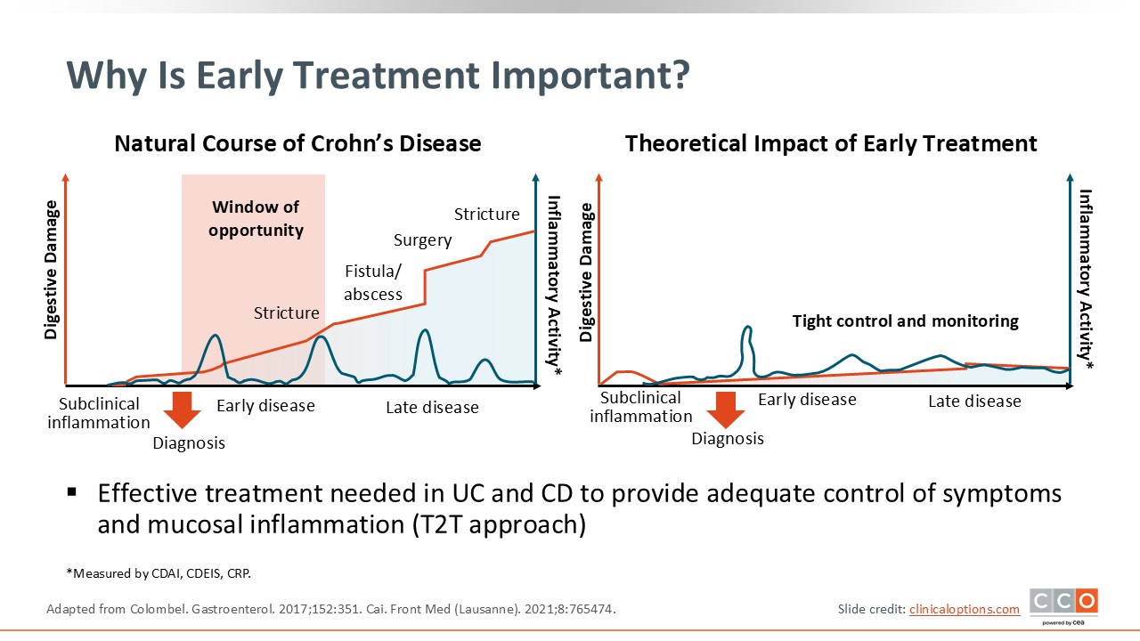 Early treatment is vital because before patients develop complications, particularly ones like stricture and fistula that may require surgical intervention, there is a window of opportunity where we can reduce that complication rate and prevent the future development of these adverse sequela of disease. In that window of opportunity, data suggest that the more aggressive treatment is in getting patients in mucosal healing, the more it dramatically reduces the risk of future complications, surgery, and more.5,13 The way we can achieve this is through treat to target. After an early diagnosis, HCPs should start aggressive, advanced therapies to reduce the risk of fistula, abscess, stricture, and surgical requirements.
