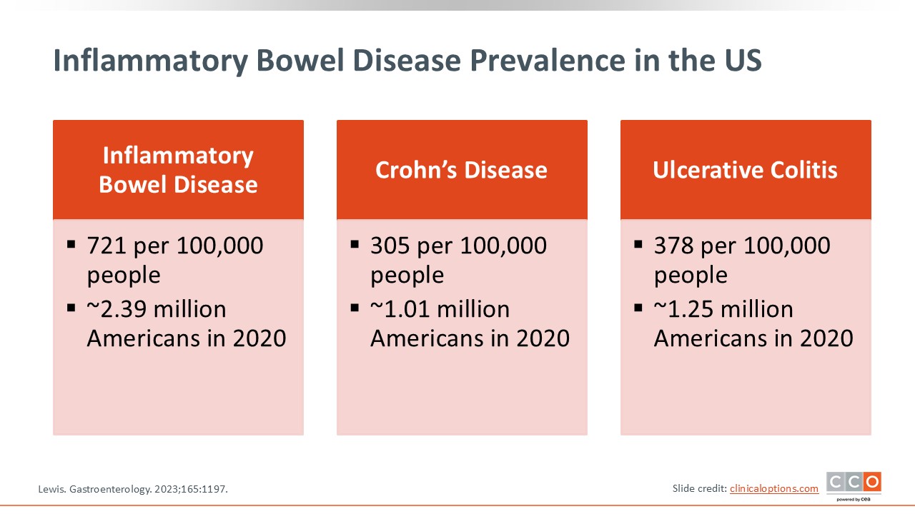 To set the stage, there are more than 2 million people in the United States with IBD. Approximately 1 million have CD or UC, with a slightly higher prevalence seen in UC, so there is a significant number of patients with IBD in the United States. Furthermore, IBD prevalence increases over time because of compounding new diagnoses among those in early adulthood, and then plateauing as people age.1