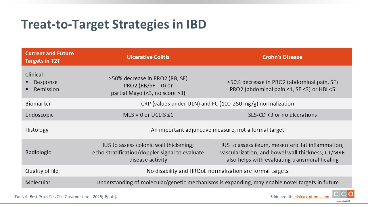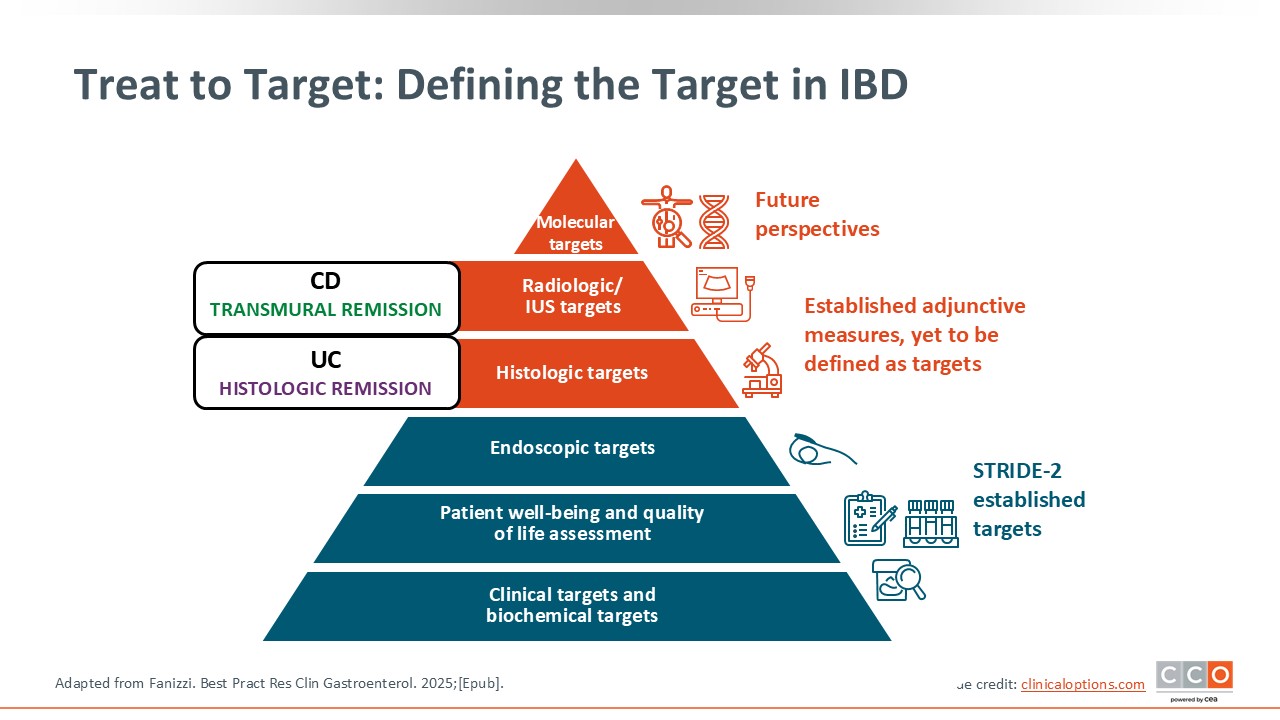 Defining the target in IBD is critical. Right now, we mostly use clinical, biomarker, and endoscopic targets. But there are emerging data demonstrating that biopsy, histologic targets in UC, and transmural targets in CD are likely associated with better reductions in future complications, quality of life, flares, and adverse complications of active disease. Current research has started to look at integrating some of these deeper levels of remission and how these can be achieved or measured. These are not formal guideline recommendations, but there are emerging targets that are associated with further clinical benefit if they are achieved.11