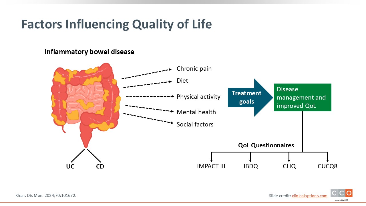 There are many factors of IBD that influence quality of life. Of course, disease activity is the primary driver of symptoms, which is associated with chronic pain; reduced physical activity, quality of life, and mental health; and various social factors. Of importance is that advanced treatment to achieve targets, mucosal healing in particular, is directly associated with improvements in various aspects of patients’ quality of life. Currently, many IBD clinical trials integrate objective measures of quality of life that can tell us about improvements in some of these areas, which is separate from objective disease measures that also are important to assess. This slide underscores that quality of life has many factors in IBD, and HCPs should assess for this, too.12