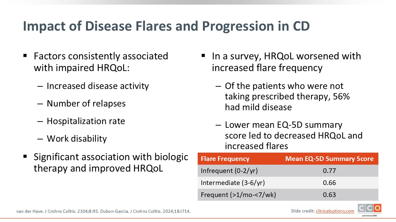 In addition to the symptom burden, disease flares and progression are significant concerns in IBD, particularly in CD, and are associated with impaired quality of life. There is an increased risk for hospitalization, work disability, and missing out on family and personal events. Data demonstrate that quality of life worsens with increased flare frequency. This is important because disease remission, which can wear many hats, includes not only an improvement in disease activity and symptom burden, but also patients’ ability to return to a normal quality of life. Furthermore, there is a significant association with advanced therapy use and improvement in quality of life, so early effective therapy may mitigate patients’ disease flares and progression and directly improve their quality of life.3,4
