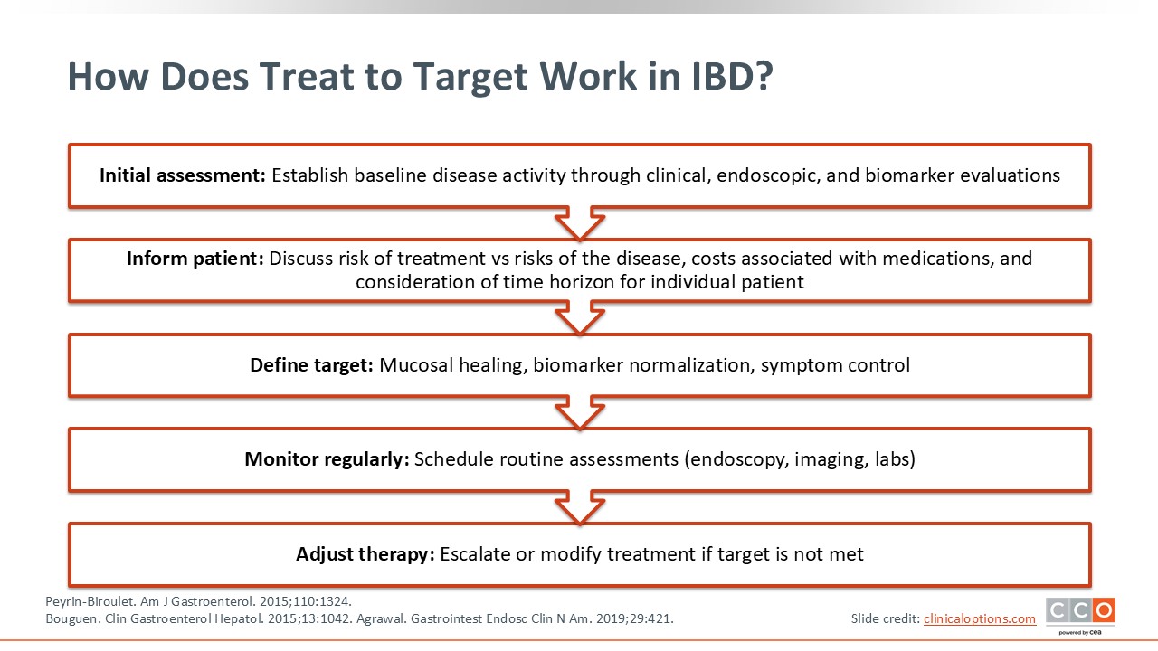 In applying treat to target, HCPs should complete a baseline assessment of patients’ endoscopic, biochemical, and symptom activity before initiating advanced therapy. HCPs then should review with patients how they will monitor response over time and at what intervals. For example, we want to see symptom control in the short term, biomarker normalization in the medium term, and mucosal healing in the long term. Furthermore, HCPs should discuss the specific assessments (eg, blood stool or endoscopy) that will applied and how therapy may be adjusted to achieve those goals.7-9