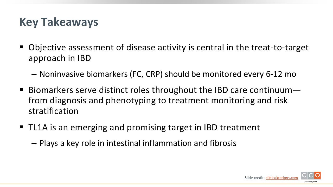 In summary, early aggressive therapy is important in patients with IBD, particularly for those with CD, to reduce long-term disease complications like stricture, fistula, and progression. Assessing for response or disease activity is necessary to ensure that patients are meeting goals via the treat-to-target approach to care. There are several tools at our disposal to measure disease activity, such as noninvasive biomarkers like FCP and CRP, which should be assessed more frequently for patients early in their disease course and at therapy initiation. Once patients are doing well in maintenance, biomarkers can be monitored at longer intervals but should continue to be used to prevent disease relapse. Furthermore, biomarkers can correlate with other measures of IBD disease activity, which is a critical component of the treat-to-target strategy. Then HCPs should use all this information to adjust therapy to help patients achieve mucosal healing.