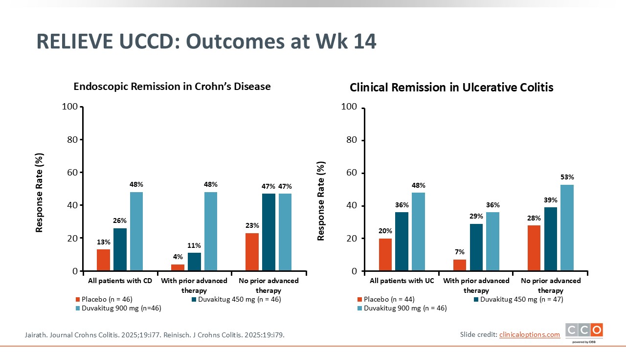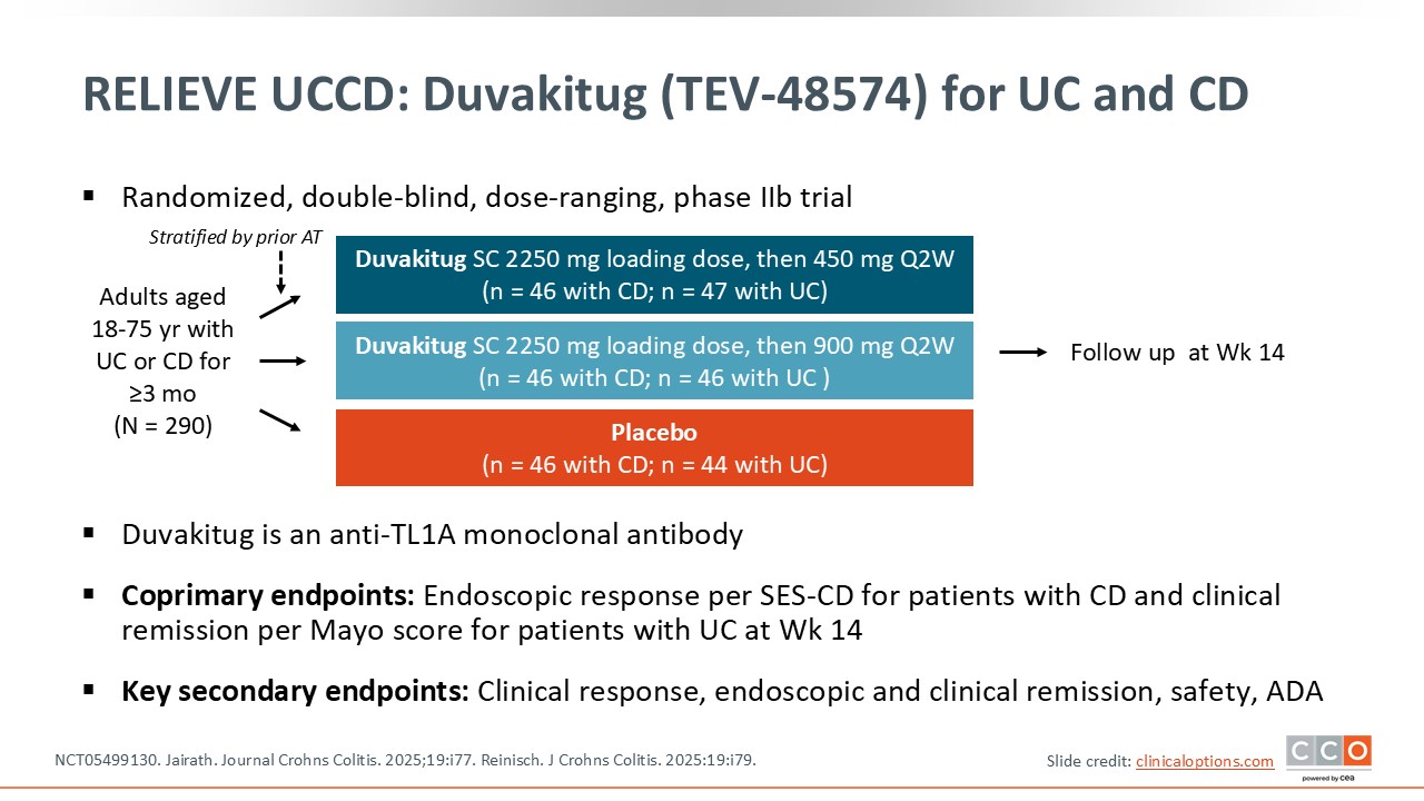 The last TL1A inhibitor to discuss is duvakitug (previously known as TEV-48574). This was studied in the phase IIb RELIEVE UCCD trial, which was a unique trial because it incorporated both patients with CD and UC (NCT05499130). Patients were randomized to receive subcutaneous duvakitug 450 mg or 900 mg (after a 2250-mg loading dose) every 2 weeks or placebo. Its endpoints included endoscopic response, clinical remission, clinical response, and safety. What is different here is that this was only an induction trial, so we only have data from 14 weeks of treatment.34,35