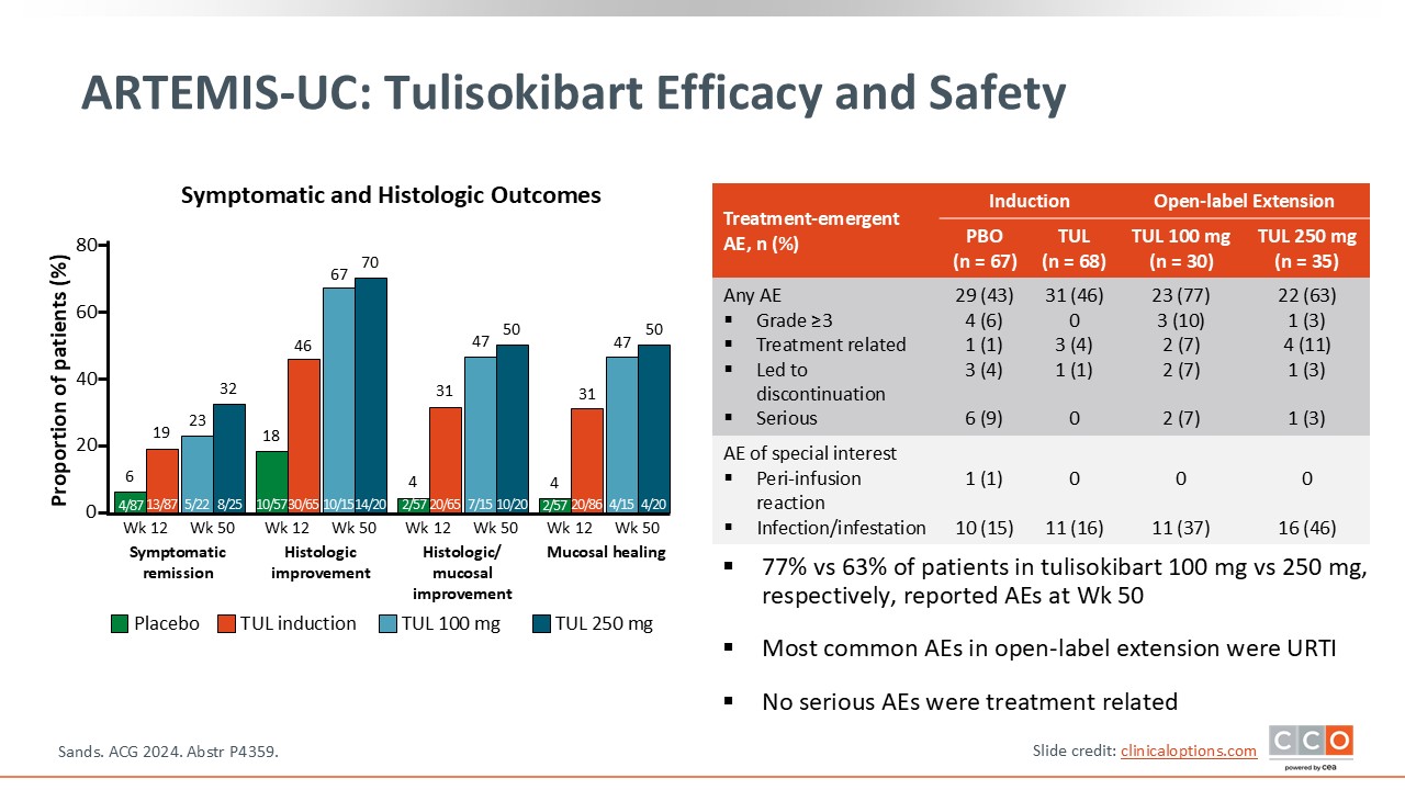 Like APOLLO-CD, there were minimal serious AEs reported, and the most common AEs were URTIs. Of importance, tulisokibart was significantly more effective than placebo in achieving important outcomes in UC, including mucosal healing.32