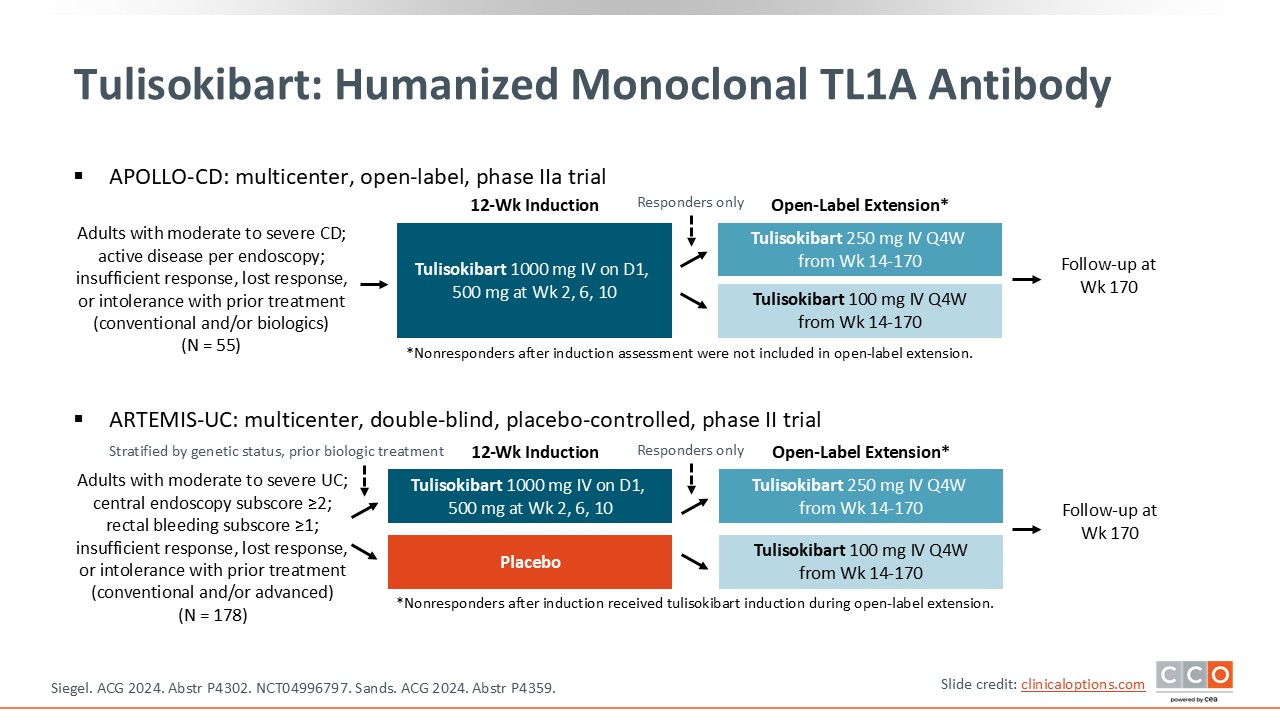 First is the phase IIa APOLLO-CD trial, which enrolled patients with moderate to severe CD and insufficient response, loss of response, or intolerance with prior treatment. Patients were given intravenous tulisokibart 1000 mg on Day 1 and 500 mg at Weeks 2, 6, and 10 within a 12-week induction period. Responders were then randomized into 2 maintenance arms: tulisokibart 250 mg vs 100 mg every 4 weeks from Week 14 to 170.31