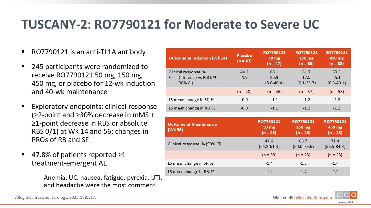 Looking at another TL1A inhibitor in the pipeline, the phase IIb TUSCANY-2 trial evaluated RO7790121. Like ARTEMIS-UC, this trial enrolled patients with moderate to severe UC and randomized them to RO7790121 50 mg, 150 mg, or 450 mg vs placebo for a 12-week induction period. Then patients received only RO7790121 50 mg, 150 mg, or 450 mg during a 40-week maintenance period. As shown on the slide, clinical responses were significantly greater in patients who were given this TL1A inhibitor vs placebo. In looking at the maintenance and induction periods, there was consistence in that those who were treated with RO7790121 were significantly more likely to achieve clinical response in both induction and maintenance compared with placebo.