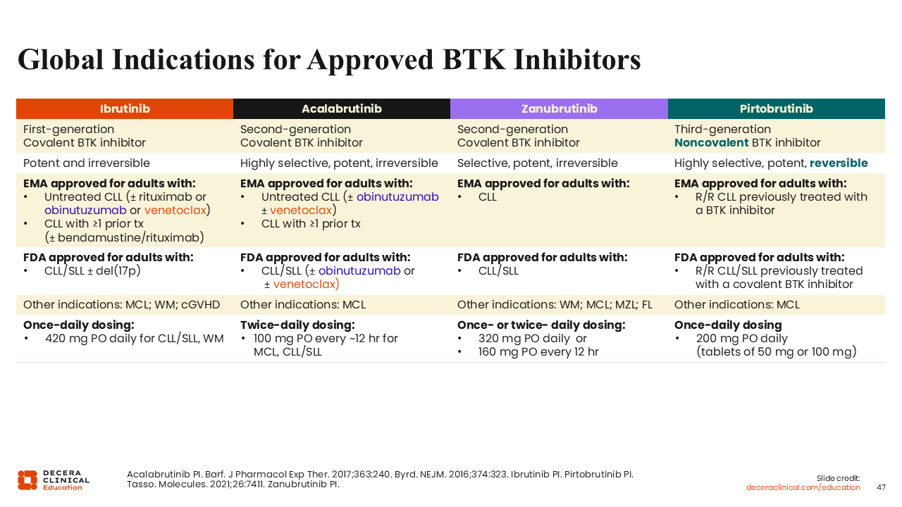 It is worth mentioning that these agents are all approved for treating mantle cell lymphoma and some are approved for treating other B-cell malignancies. Zanubrutinib is the most broadly approved for these, including Waldenström’s macroglobulinemia, marginal zone lymphoma, and follicular lymphoma.