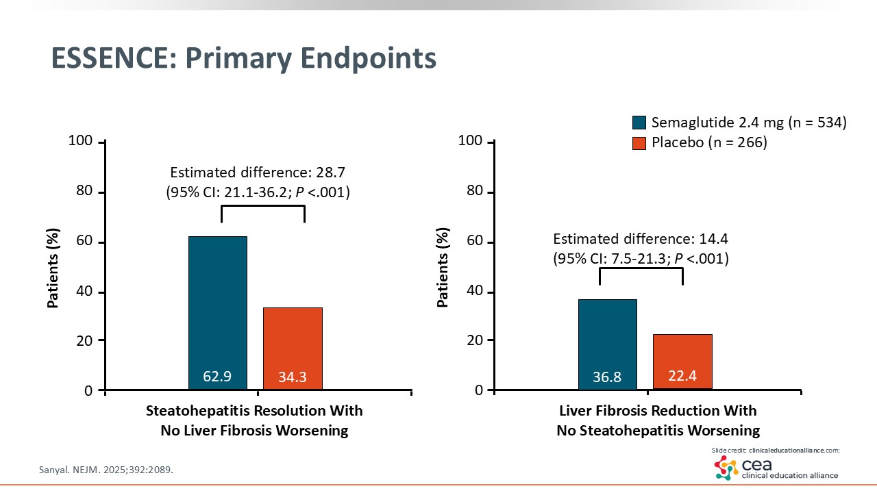 MASH resolution is defined as steatohepatitis resolution, which is the change in the score of inflammation, steatosis, and ballooning. The ESSENCE trial showed that a statistically significant number of patients achieved MASH resolution with semaglutide vs placebo. The estimated difference was almost 30%. This is an important endpoint that the FDA looks for and that is enough to submit for accelerated approval. The other endpoint illustrated on this slide is important to hepatology: liver fibrosis improvement by stage. That was met in almost 15% of patients in the semaglutide arm compared with those in the placebo arm, which was statistically significant. Because semaglutide achieved both primary endpoints in the ESSENCE trial, I am anticipating its approval soon.15