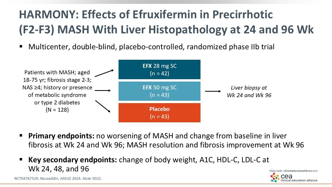 HARMONY: Effects of Efruxifermin in Precirrhotic (F2-F3) MASH With Liver Histopathology at 24 and 96 Weeks