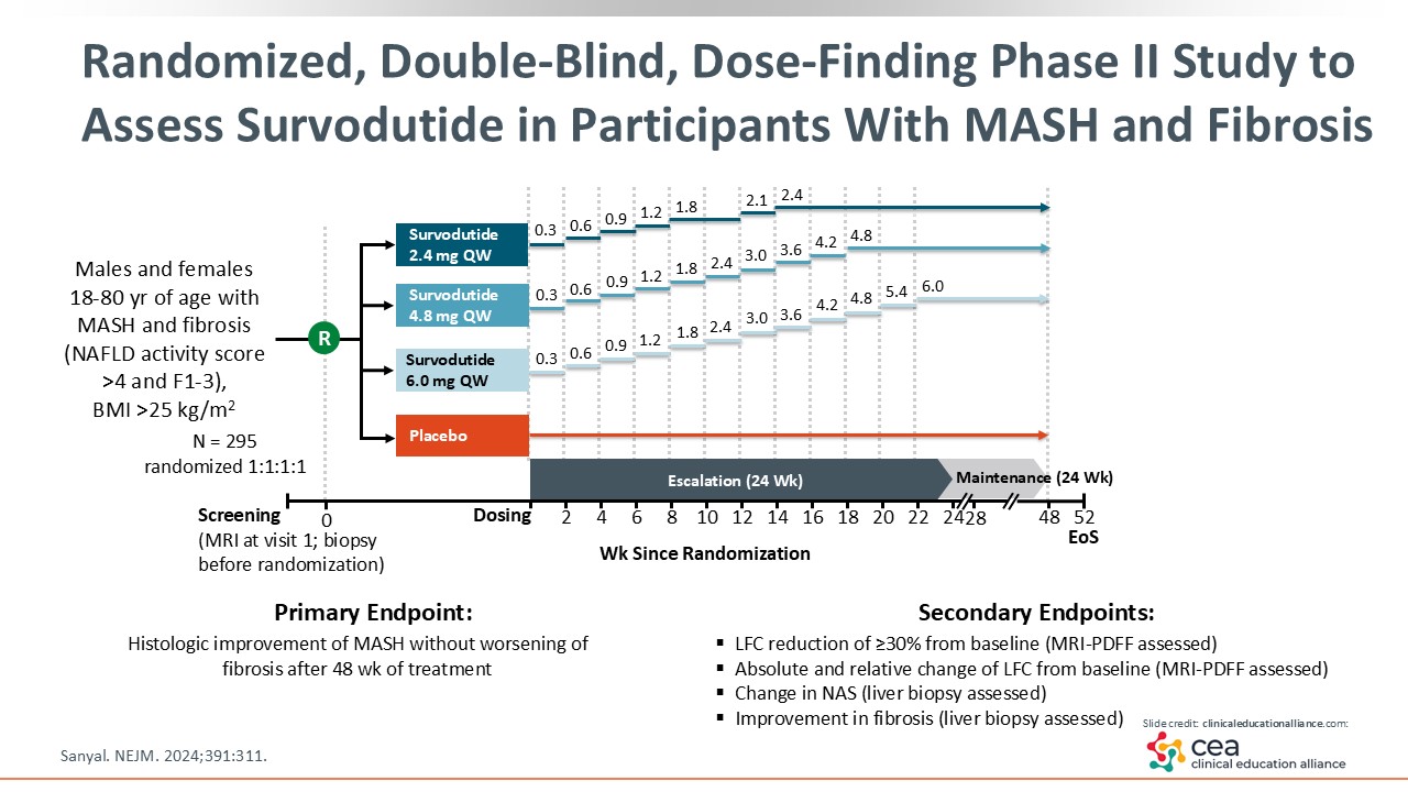 This slide shows the design of the dose-finding, double-blind, randomized phase II trial comparing survodutide 2.4, 4.8, and 6.0 mg with placebo. This was a 52-week trial, with up to 24 weeks of titration to overcome any dose-related AEs, that enrolled patients with MASH and fibrosis stage 1-3. In total, 295 patients were enrolled and randomized to each treatment in a 1:1:1:1 ratio.21
