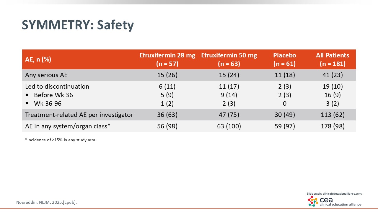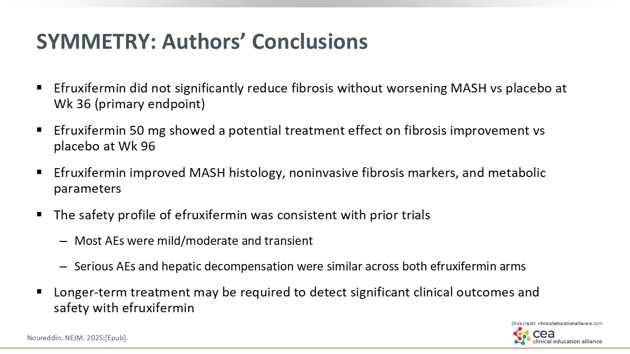 With the SYMMETRY trial, there was fibrosis improvement by at least one stage at Week 96 in the efruxifermin 50 mg arm vs placebo. Furthermore, the reported AEs were mostly gastrointestinal related and mild to moderate in severity.24